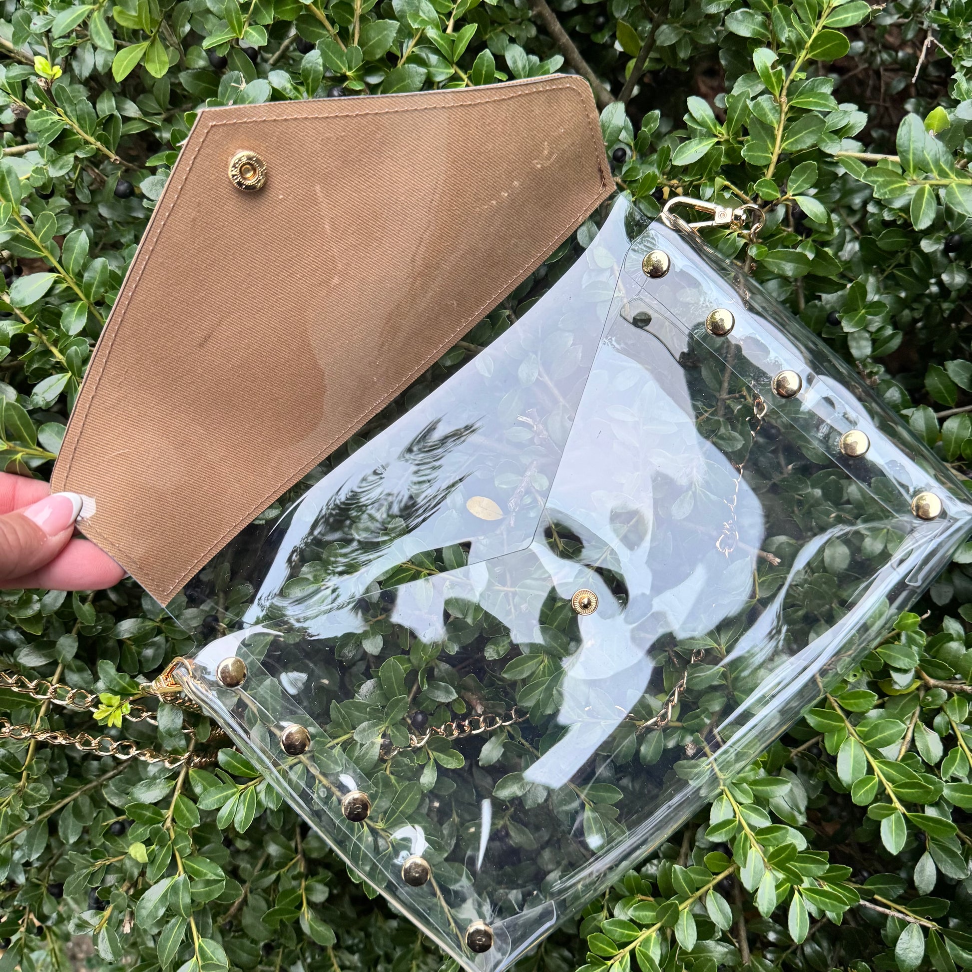 Your go-to bag for concerts, sporting events, and nights out! This best-selling clear stadium bag features a chic repurposed designer flap with a snap closure, gold studs and a detachable gold crossbody chain.