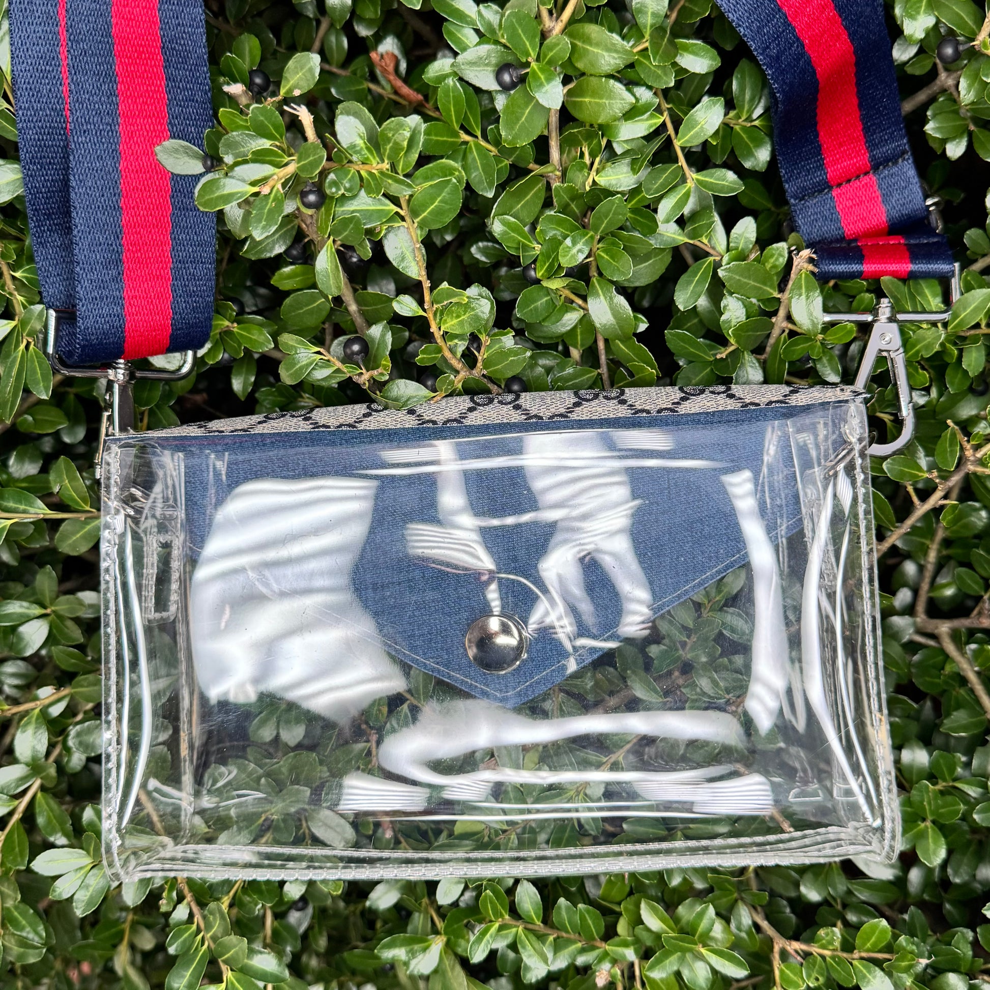 This clear stadium bag is where sporty meets chic ✨ The flap is crafted from repurposed designer canvas and paired with a bold navy + red stripe adjustable strap for that effortless cool girl moment. Perfect for concerts, stadium games, girls’ nights, and travel — always compliant, always stylish.